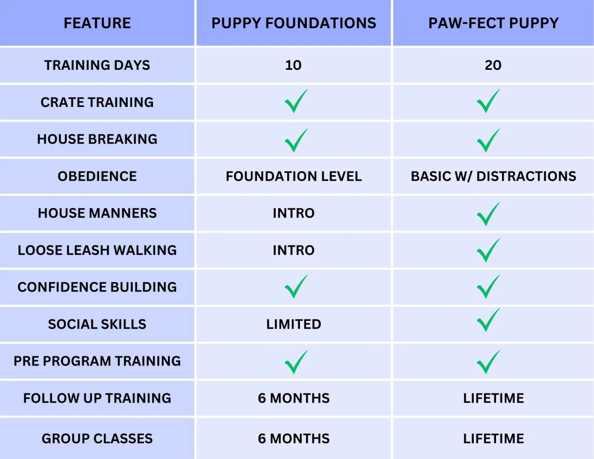 Ongoing Support: All of our puppy training programs come with an element of support for you, the pet parent. In person follow up training and group classes to help keep things on track and set you up for long term success.